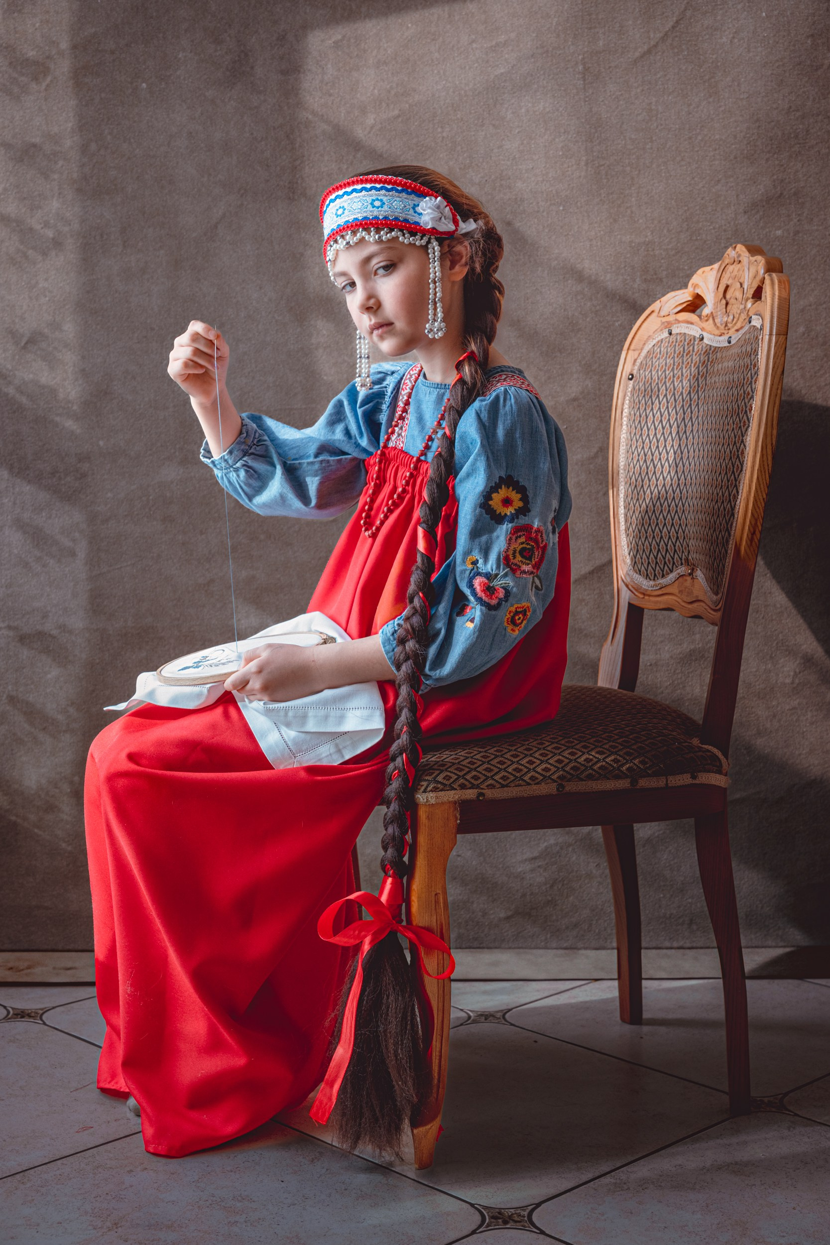 We drew inspiration from the paintings of Russian artists — the kind filled with soulfulness, light, and delicate beauty. For Aurora, we chose an outfit worthy of a true fairytale heroine: a bright red sarafan and an elegant kokoshnik. This look instantly transported us into the atmosphere of old Russian life, filled with tranquility and harmony.