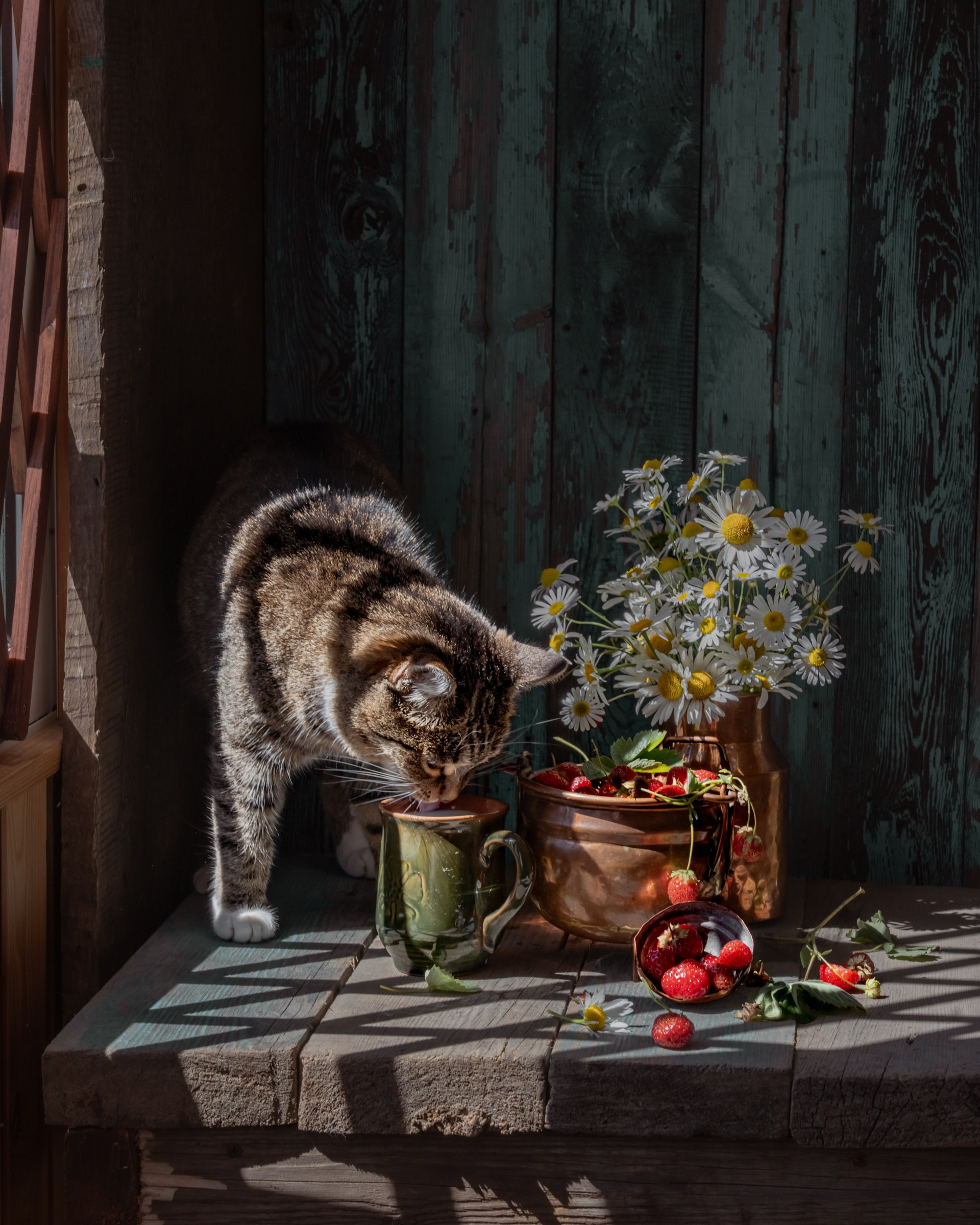 Маруся оставила след в истории этого лета. Она так же оставила отпечатки на отмостке нашего дачного домика. И на каждой второй фотографии дачного лета есть следы моей пушистой помощницы. То хвост мелькнет на заднем плане, то любопытный нос в кадр влезет, проверяя композицию. А на самом вкусном кадре она и вовсе оставила свой отпечаток — просто решила освежиться молочком.