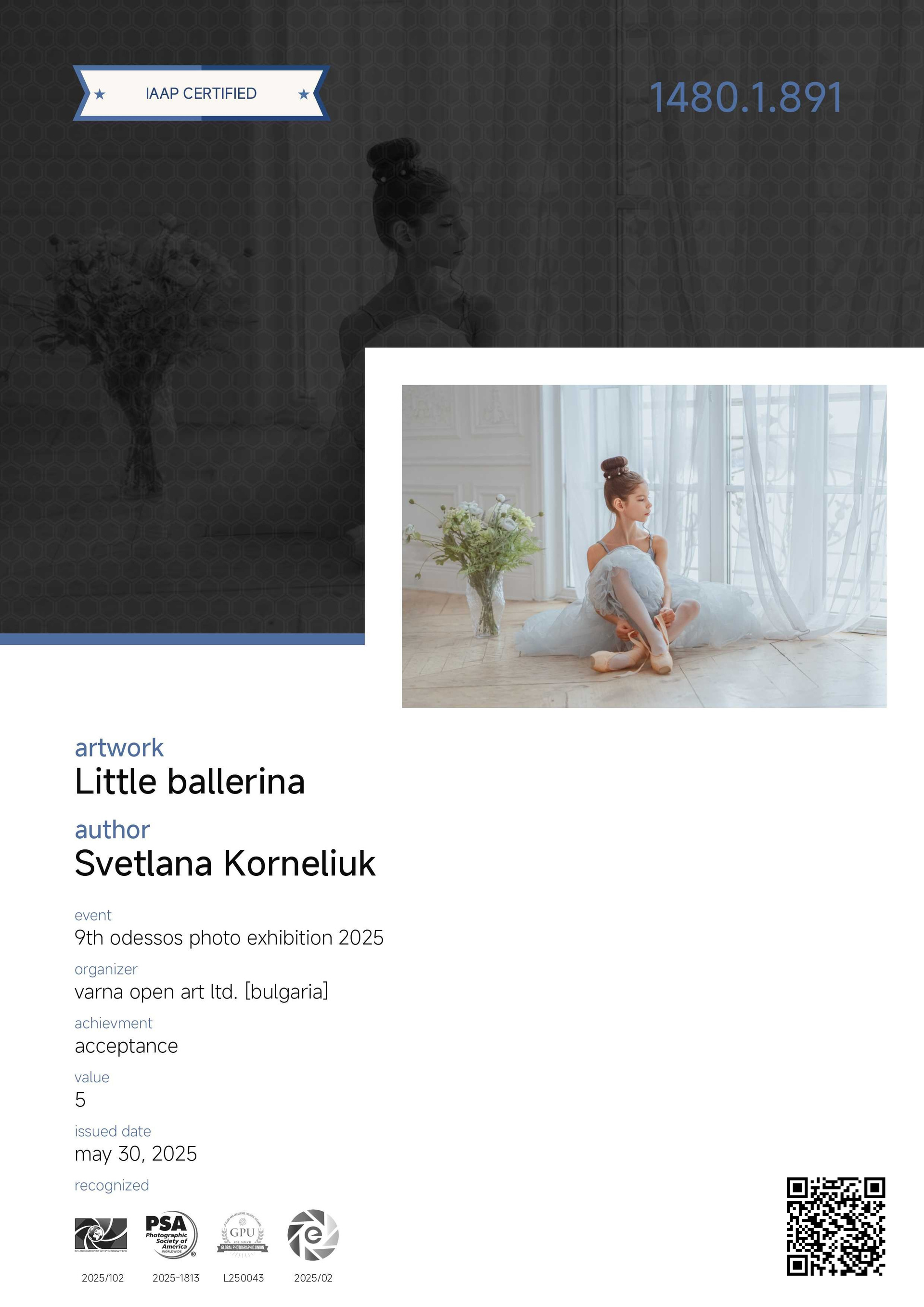 It’s especially rewarding that our work with Sofia has received high praise from the professional community. The photos have received multiple acceptances and won a Silver Medal at the IAAP 2025 artistic photography competition in Romania. Additionally, photographs from our shoots have been published in Holly Way and Top Posters magazines. This proves once again that high-quality ballet photography is in demand and interesting not just as a personal memory, but as an art form.