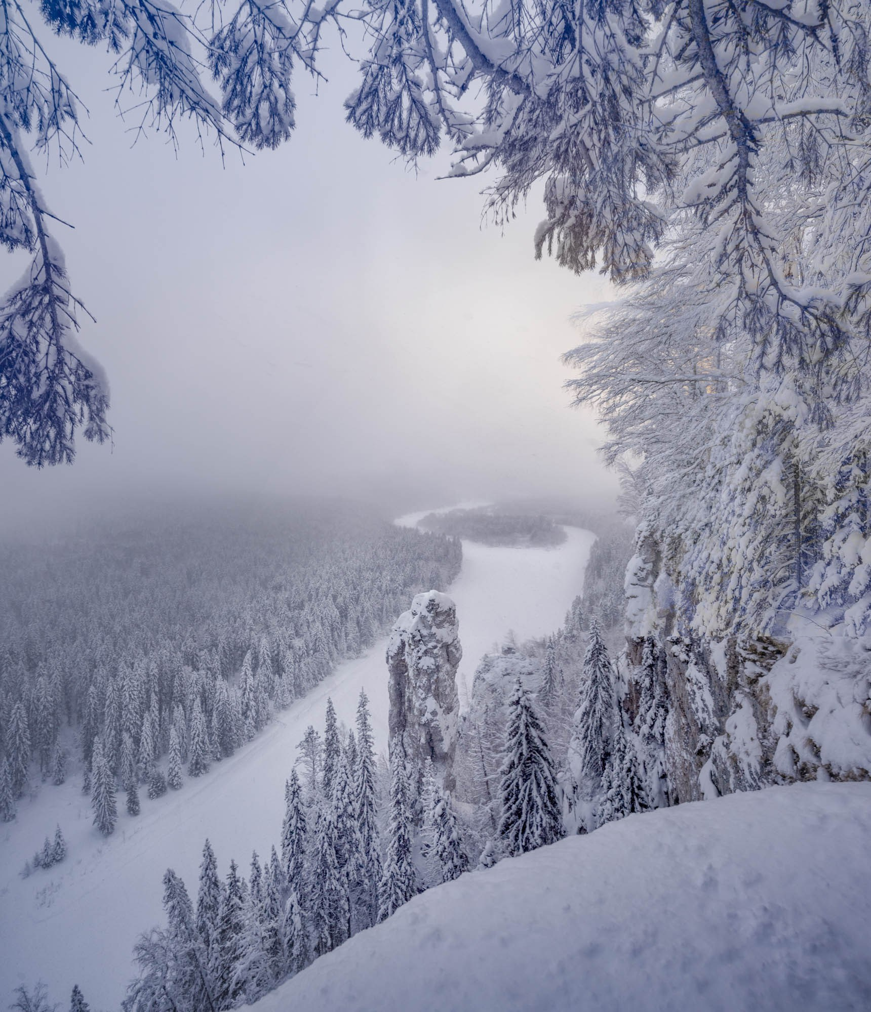 Climbing to the rocks of the Devil’s Finger in winter is a separate adventure. The steep climb up, when the shoes slip, is given with effort, but what a reward awaits at the top! From the height, a breathtaking panorama opens up: the endless taiga, the winding ribbon of the river and the pillars themselves, crowned with snow caps. Photographing here is a pleasure. Contrasts, textures, and the play of light and shadow on rock reliefs create an endless field for creativity. This is a place where you feel like a grain of sand against the backdrop of eternity, and it was this emotion that I tried to convey in the frame.