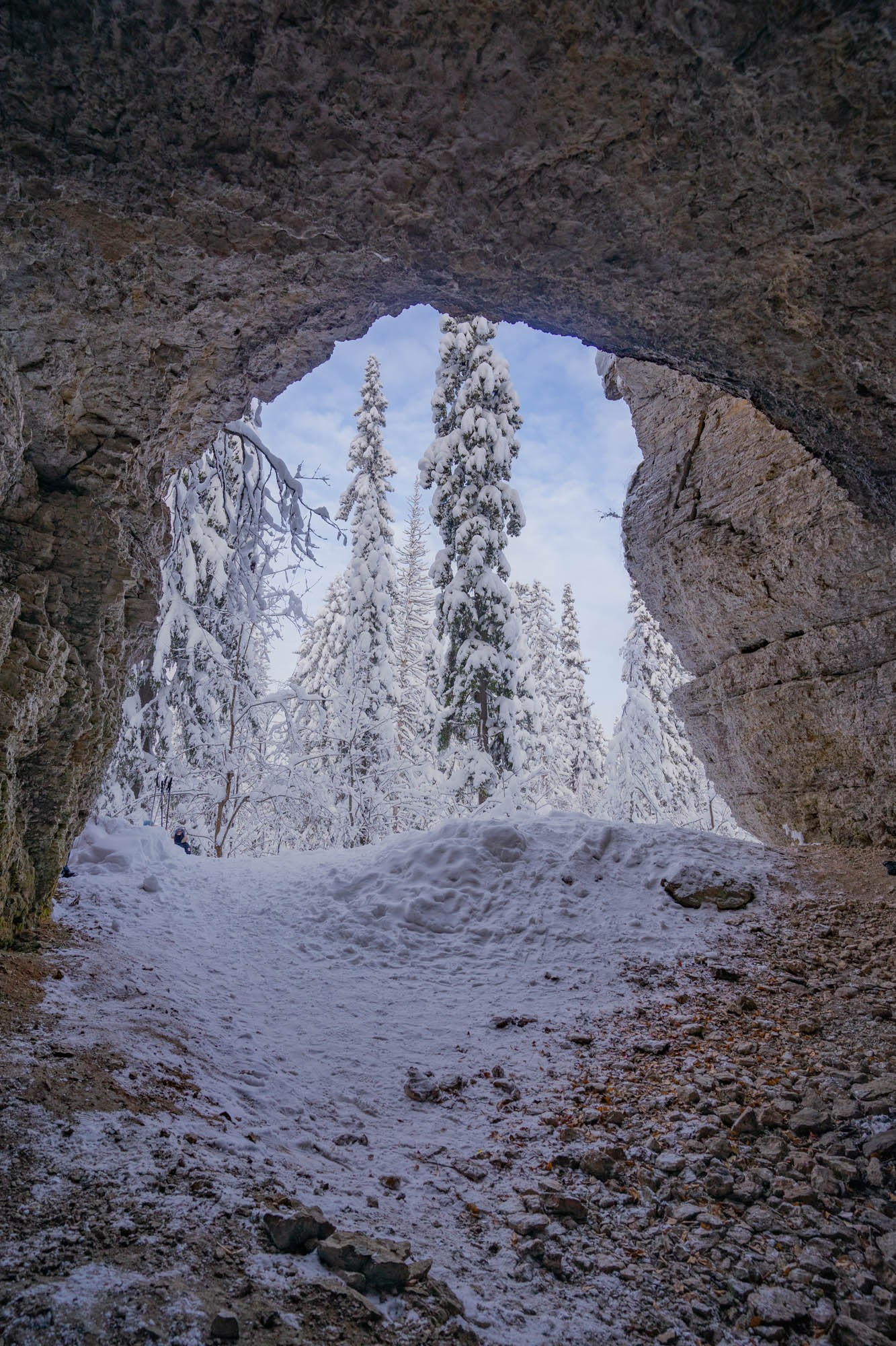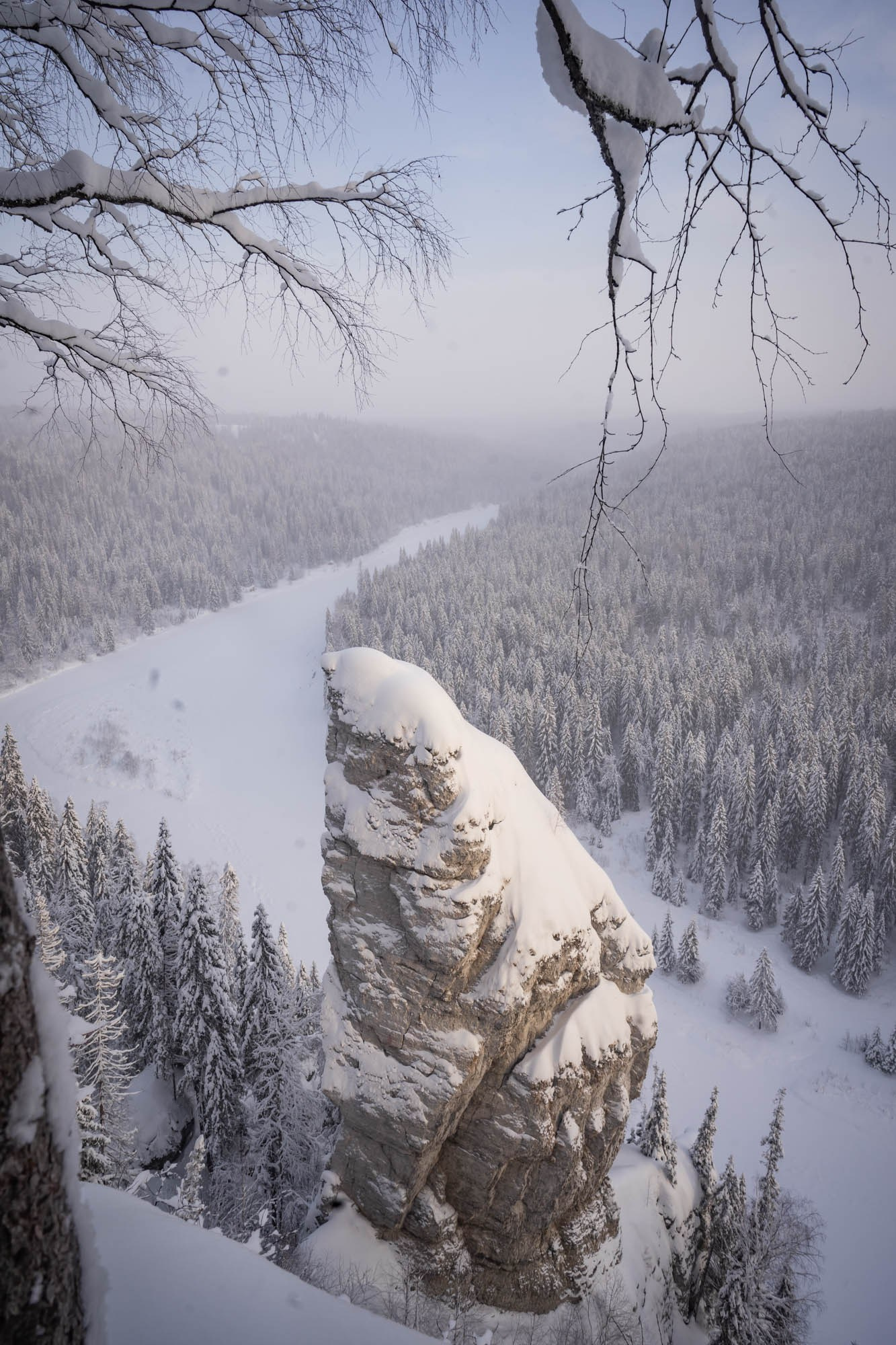 Our winter safari started from a place of power — The Usvinsky pillars. It is a monumental stone wall rising 120 meters above the frozen river Usva. Tourists and rock climbers tend to come here in summer, but in winter this place is completely transformed. The noise of the river is replaced by deathly silence, and the riot of greenery is replaced by monochrome graphics of black rocks and white snow.