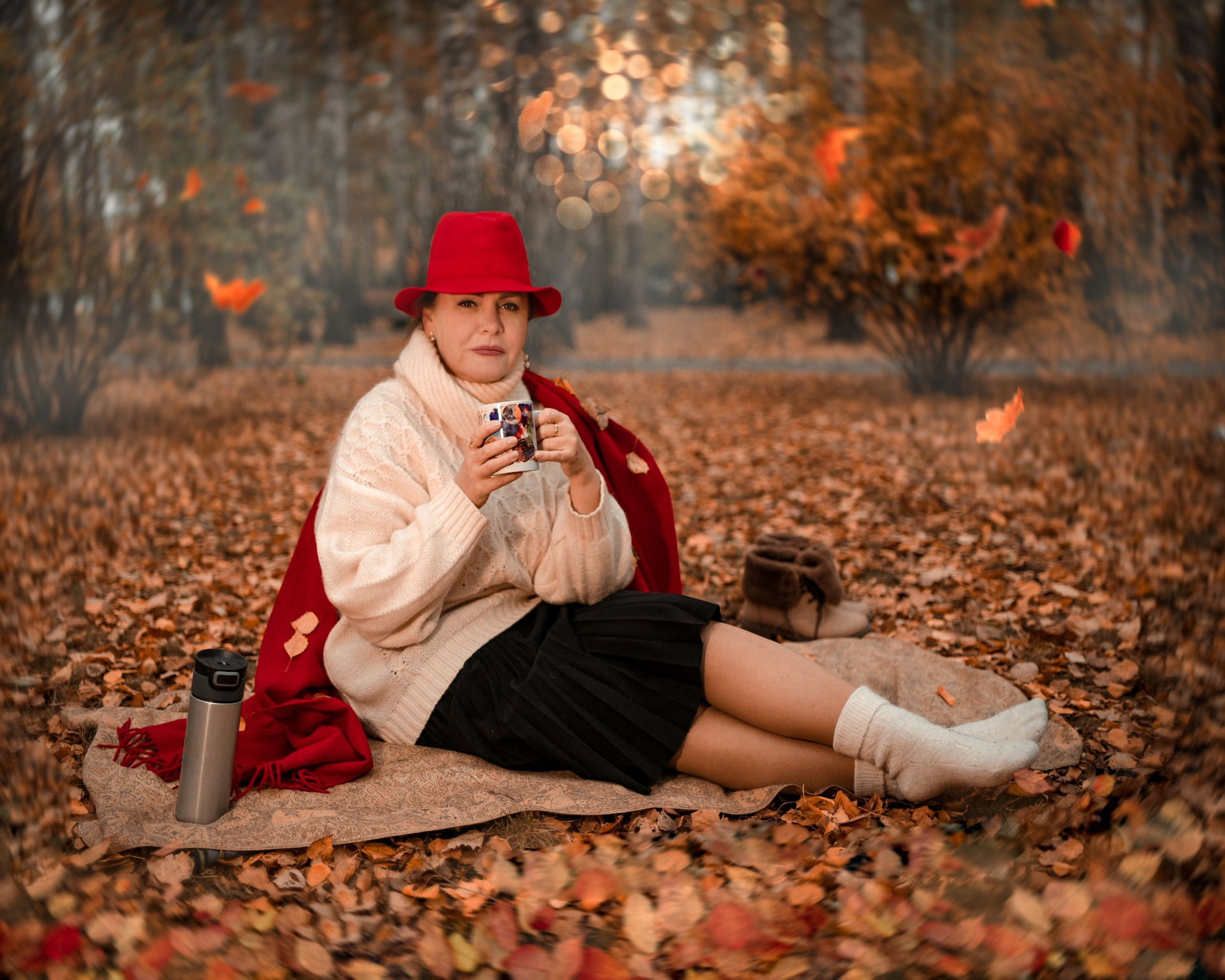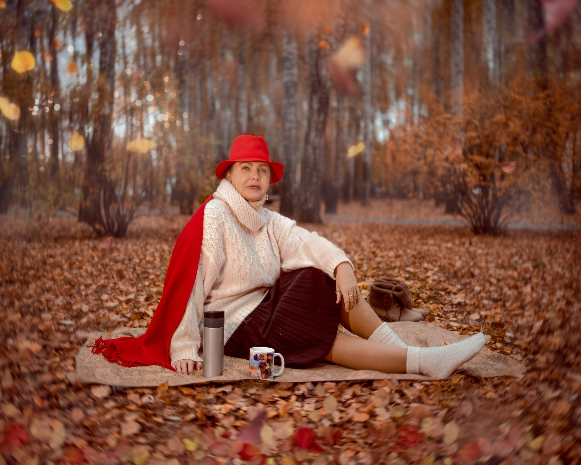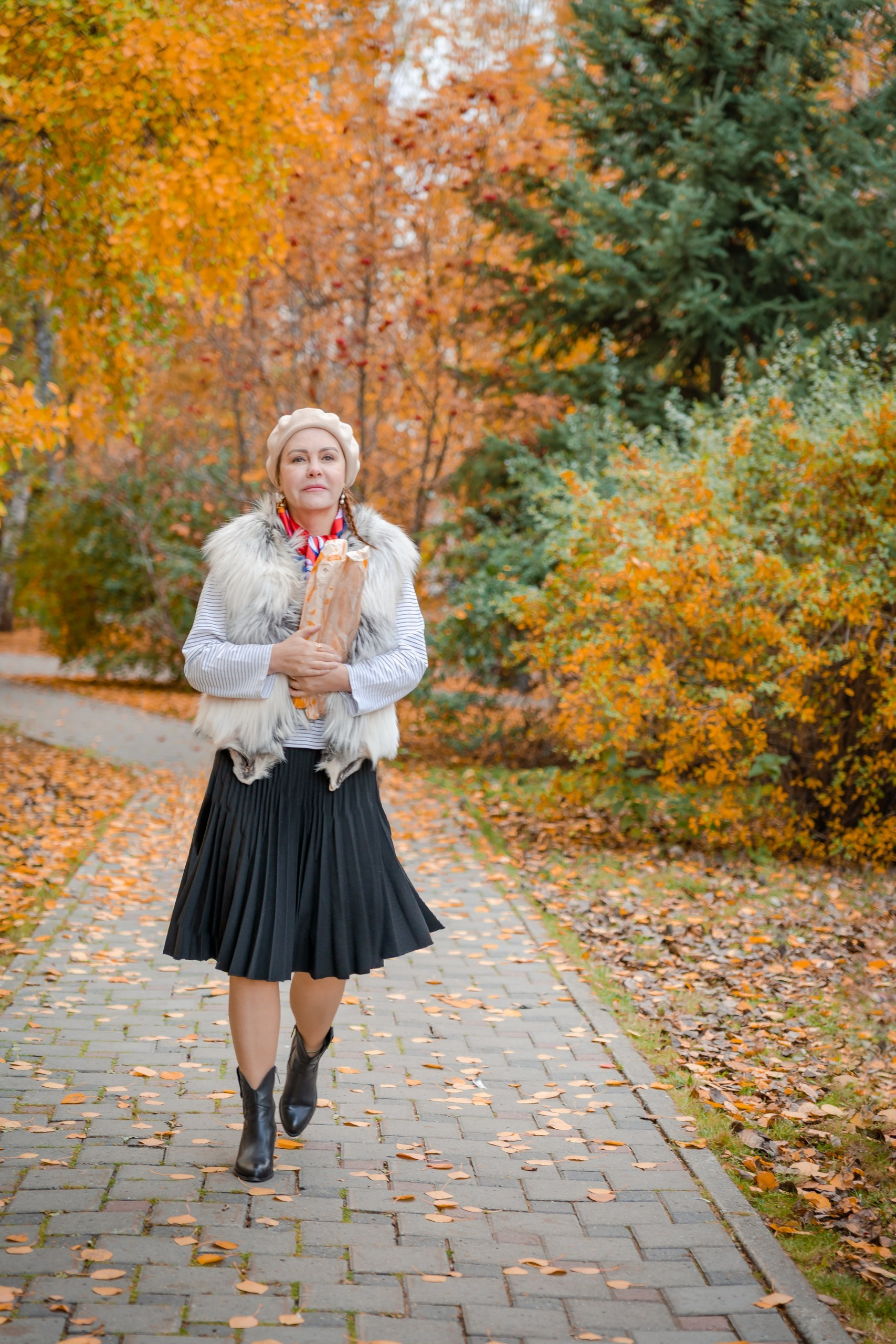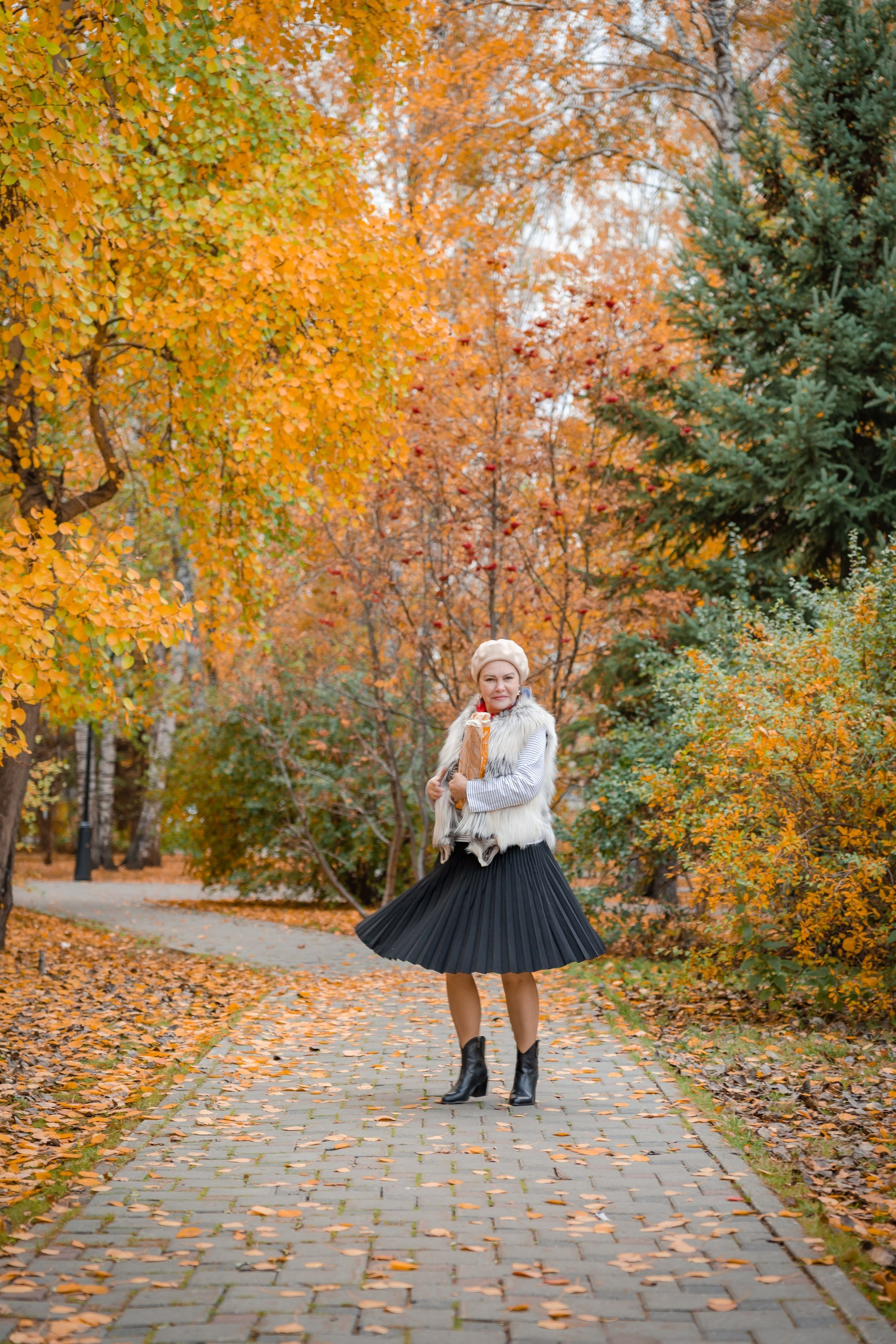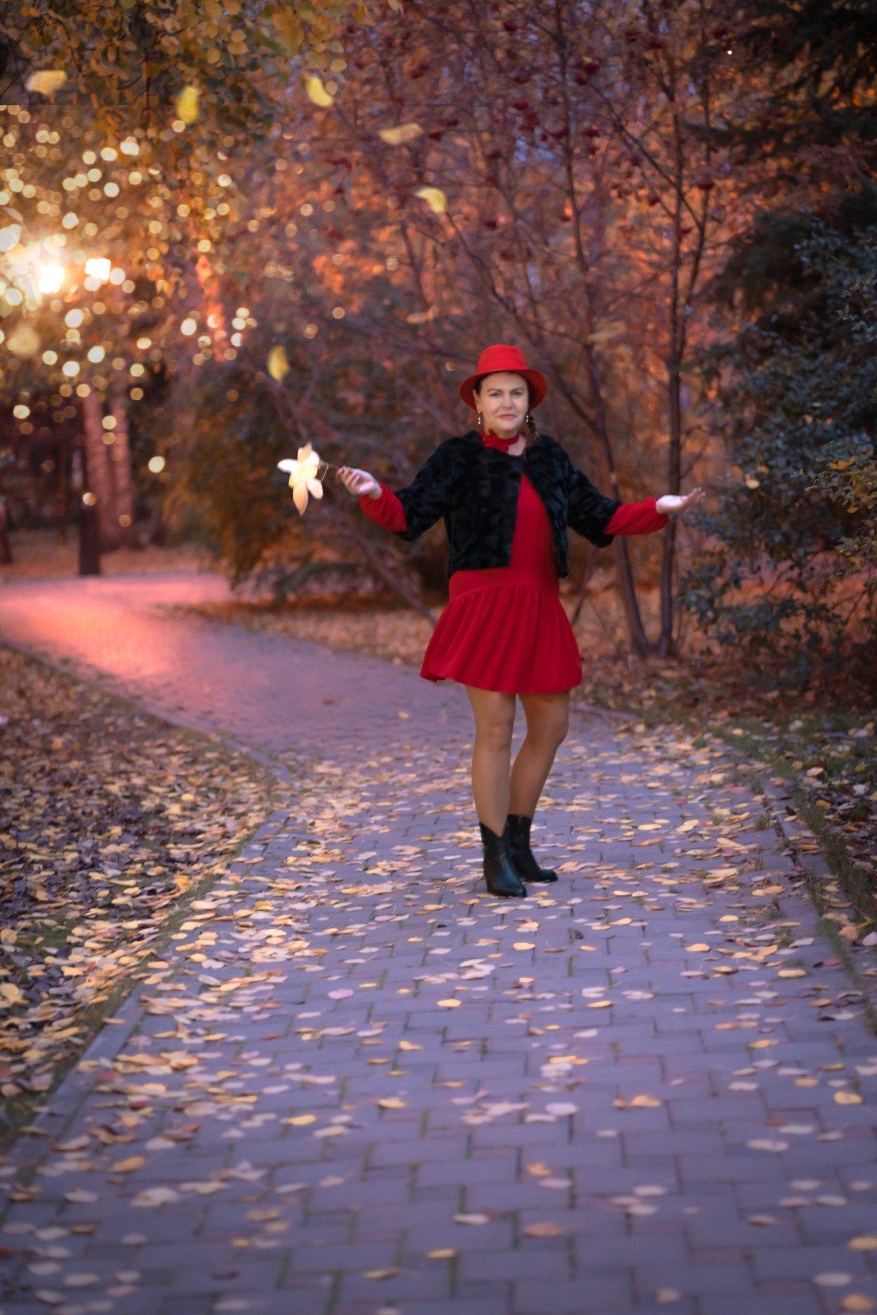 Красный — цвет смелости. Он требует от героини характера, а от фотографа — умения поймать свет. В осеннем парке Тюмени этот акцент сыграл ярко: золото листвы, сдержанное пальто и дерзкая шляпа, которая говорит о женской индивидуальности громче любых слов.