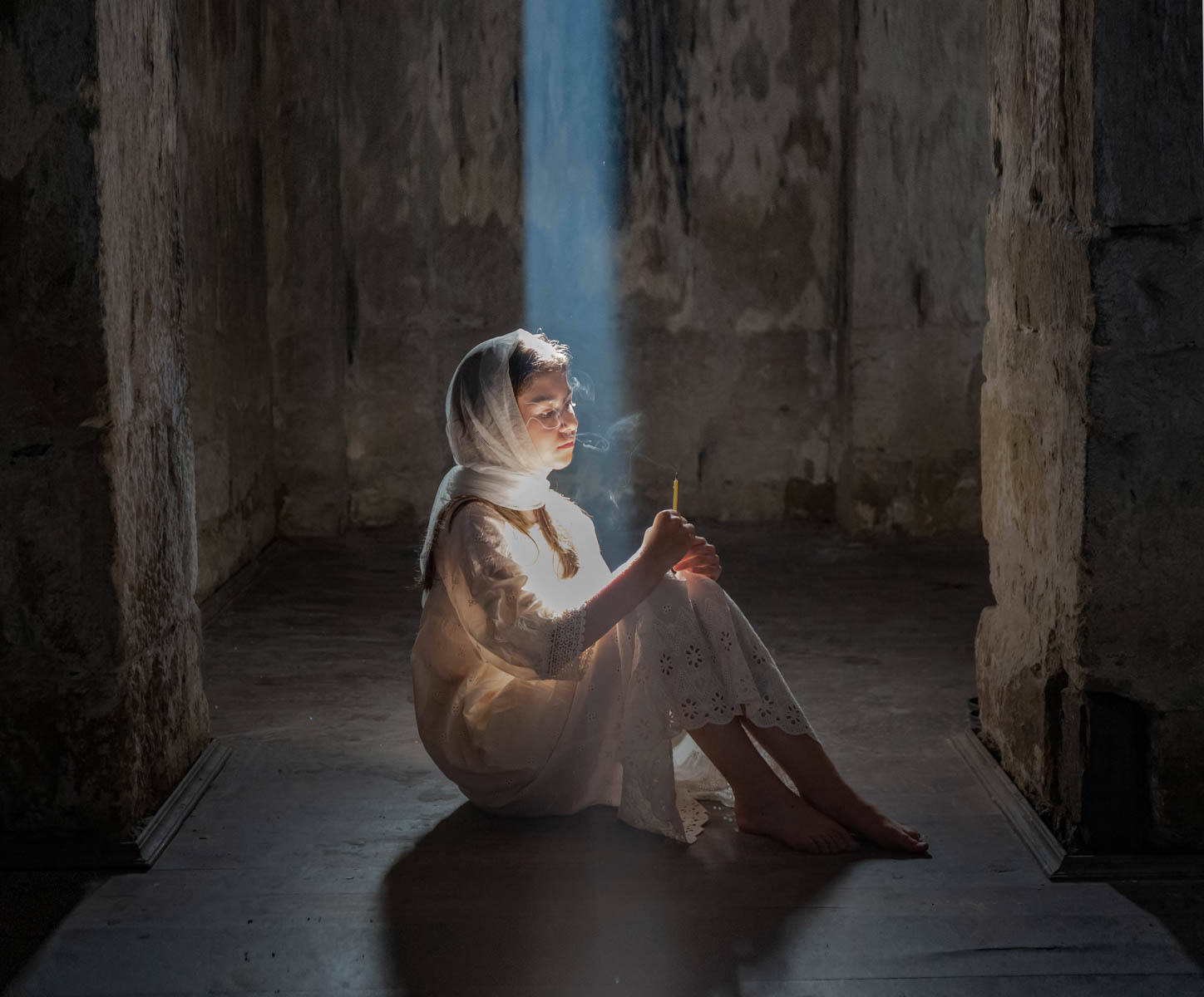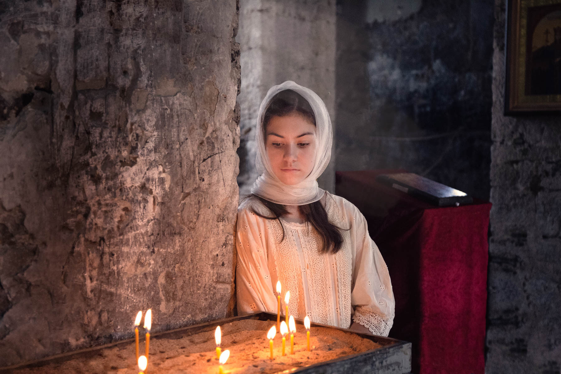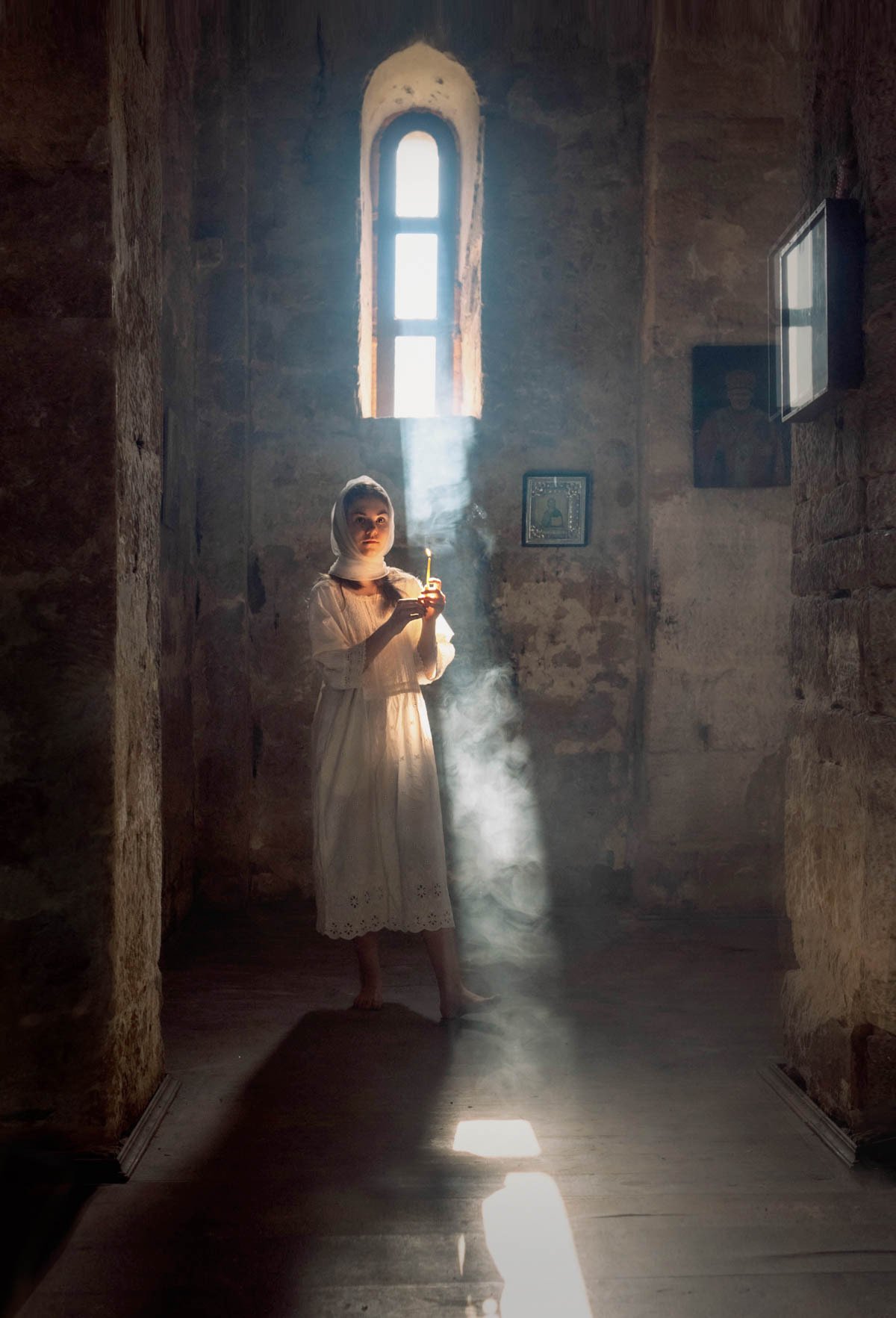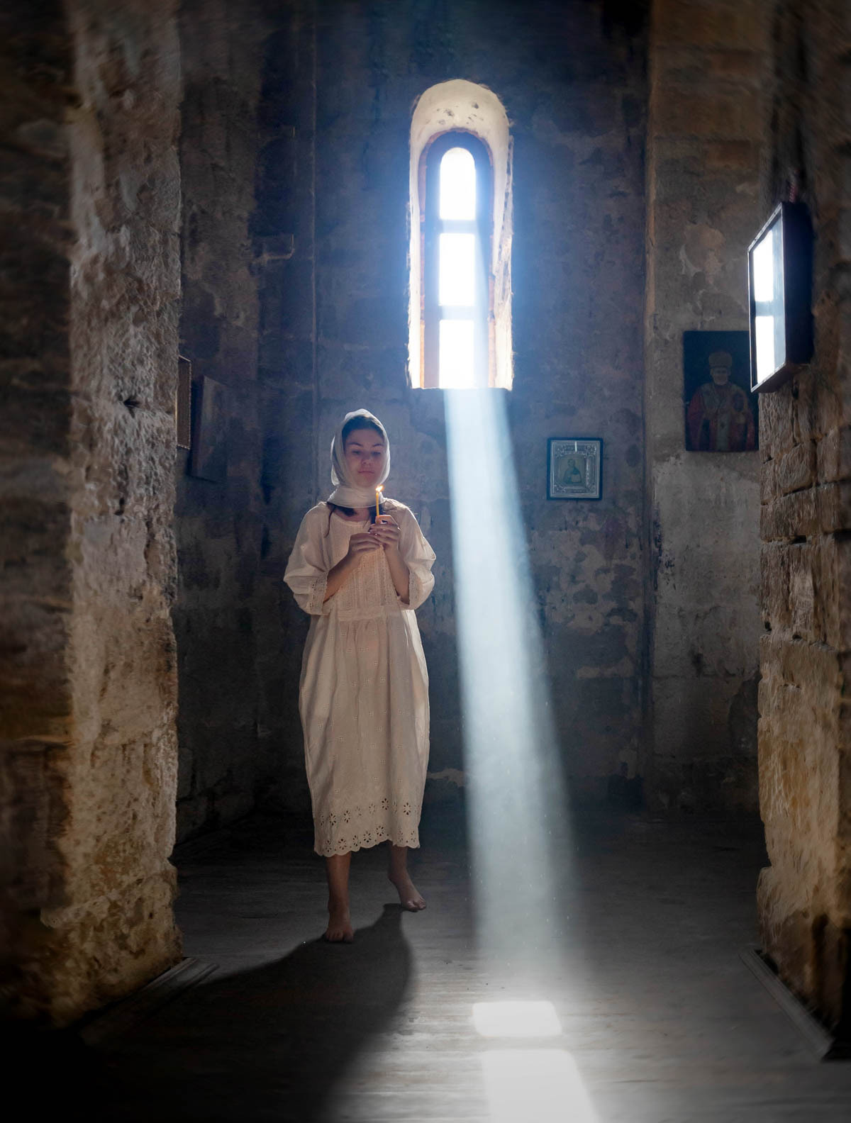 После динамики Домбая — резкая смена атмосферы. Шоанинский храм (X век) на отроге горы — это место тишины и силы. Как фотограф, я видела в нем идеальную «модель»: лаконичную форму, выверенную векторами, помещенную в бесконечный природный контекст. Здесь хочется снимать не только сам храм, но и детали, которые говорят больше, чем общий план: Свет в храме, шероховатость камней, дымок от свечи создают потрясающую умиротворяющую атмосферу.