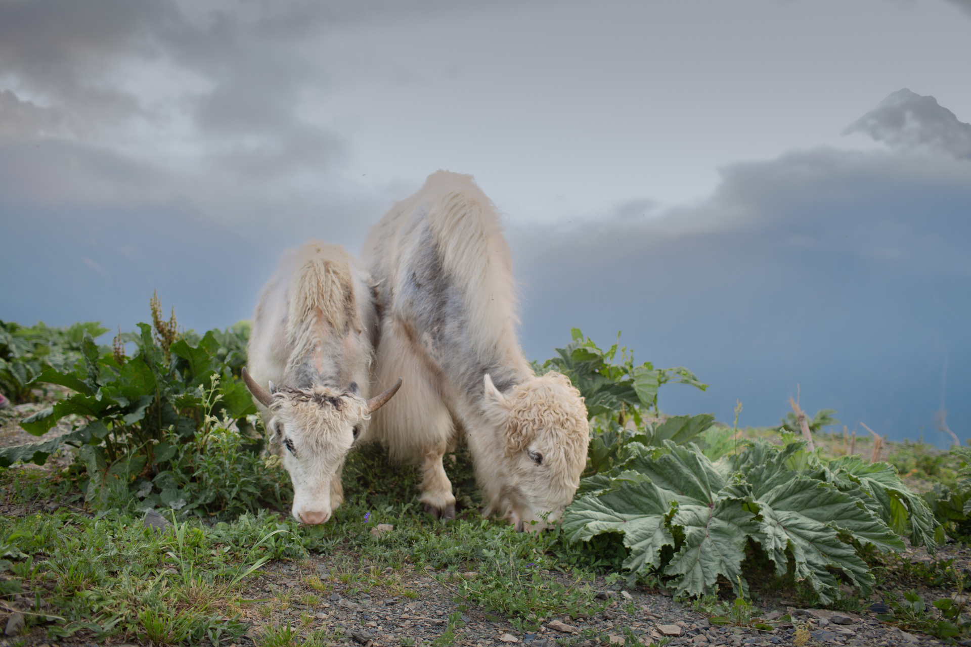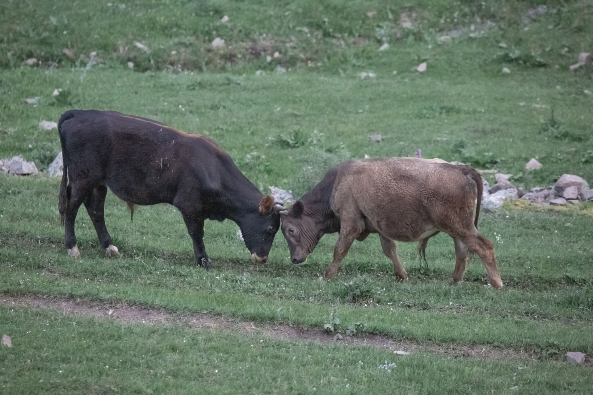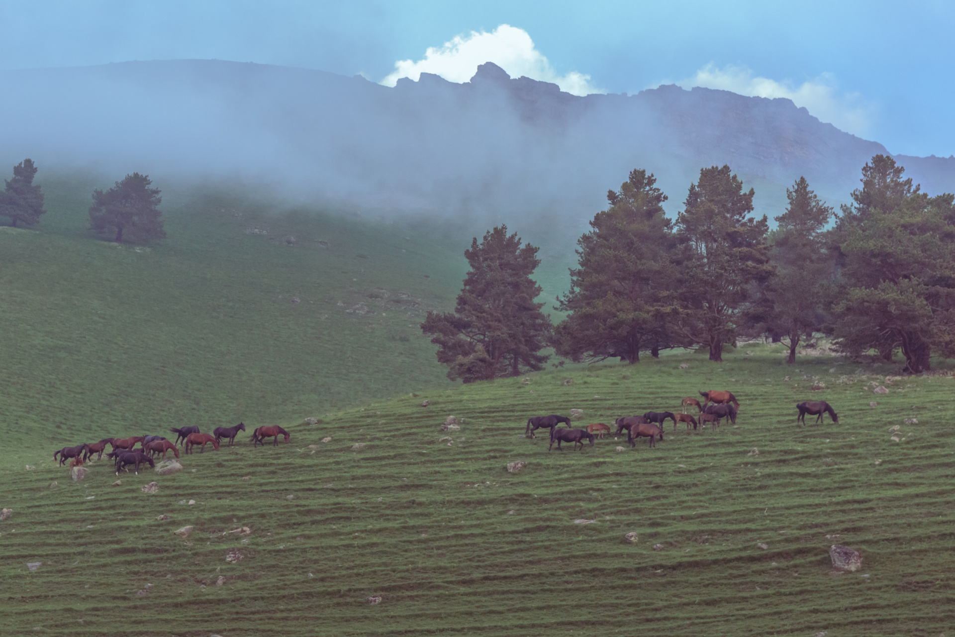 А еще- здесь можно снять настоящую пастораль. Летнее пастбище. Лошади, козы, коровы, овцы пасутся на зеленых низовьях гор. Меня умилил теленок с черным язычком, пьющий воду из ручья протекающего среди цветущих трав. Вдоль ручья — цветут голубые незабудки, белый и розовый тысячелистник, множество других растений. Обратите внимание, что это уже летние цветы, в отличие от первоцветов на озере Шобайдак. В низовьях гор намного теплее, лето наступает вовремя.