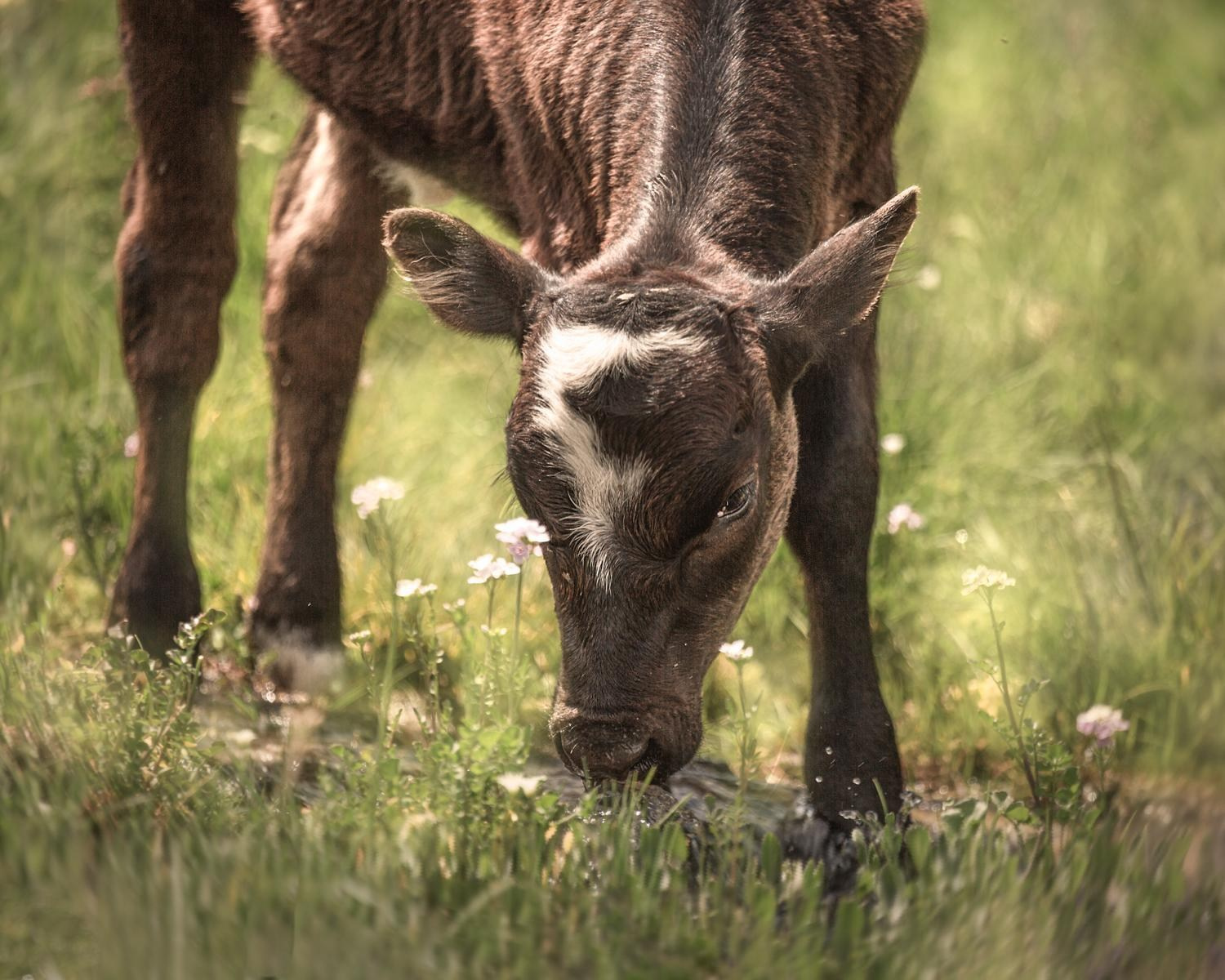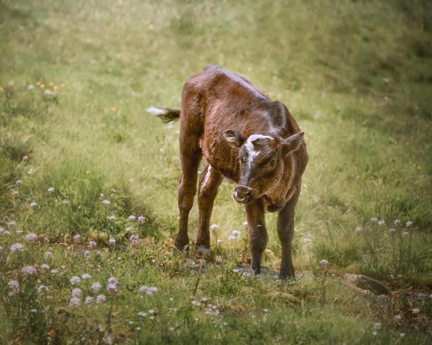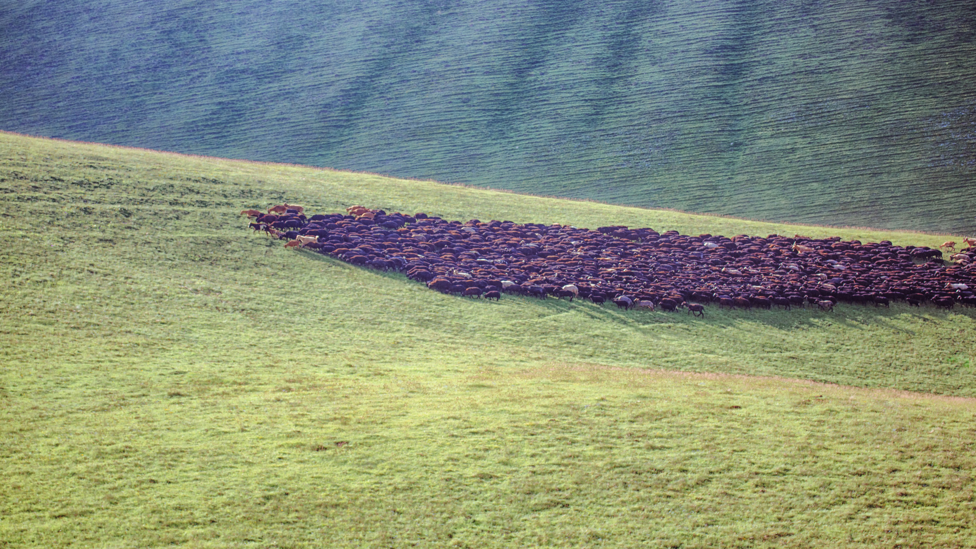 А еще- здесь можно снять настоящую пастораль. Летнее пастбище. Лошади, козы, коровы, овцы пасутся на зеленых низовьях гор. Меня умилил теленок с черным язычком, пьющий воду из ручья протекающего среди цветущих трав. Вдоль ручья — цветут голубые незабудки, белый и розовый тысячелистник, множество других растений. Обратите внимание, что это уже летние цветы, в отличие от первоцветов на озере Шобайдак. В низовьях гор намного теплее, лето наступает вовремя.